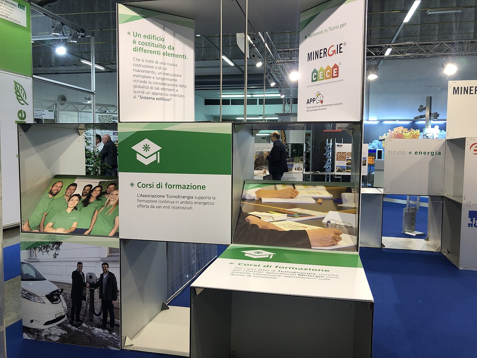 Nello spazio espositivo istituzionale, TicinoEnergia fa bella mostra di uno stand completamente nuovo in cui il visitatore viene accompagnato tra i nostri ambiti di competenza: consulenza, formazione, sistema edificio ed efficienza energetica a 360 gradi.